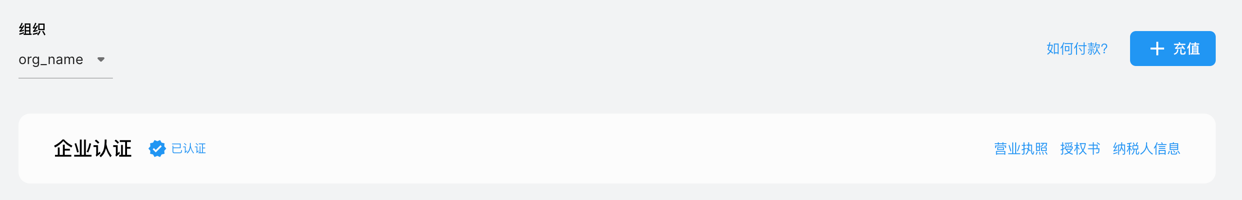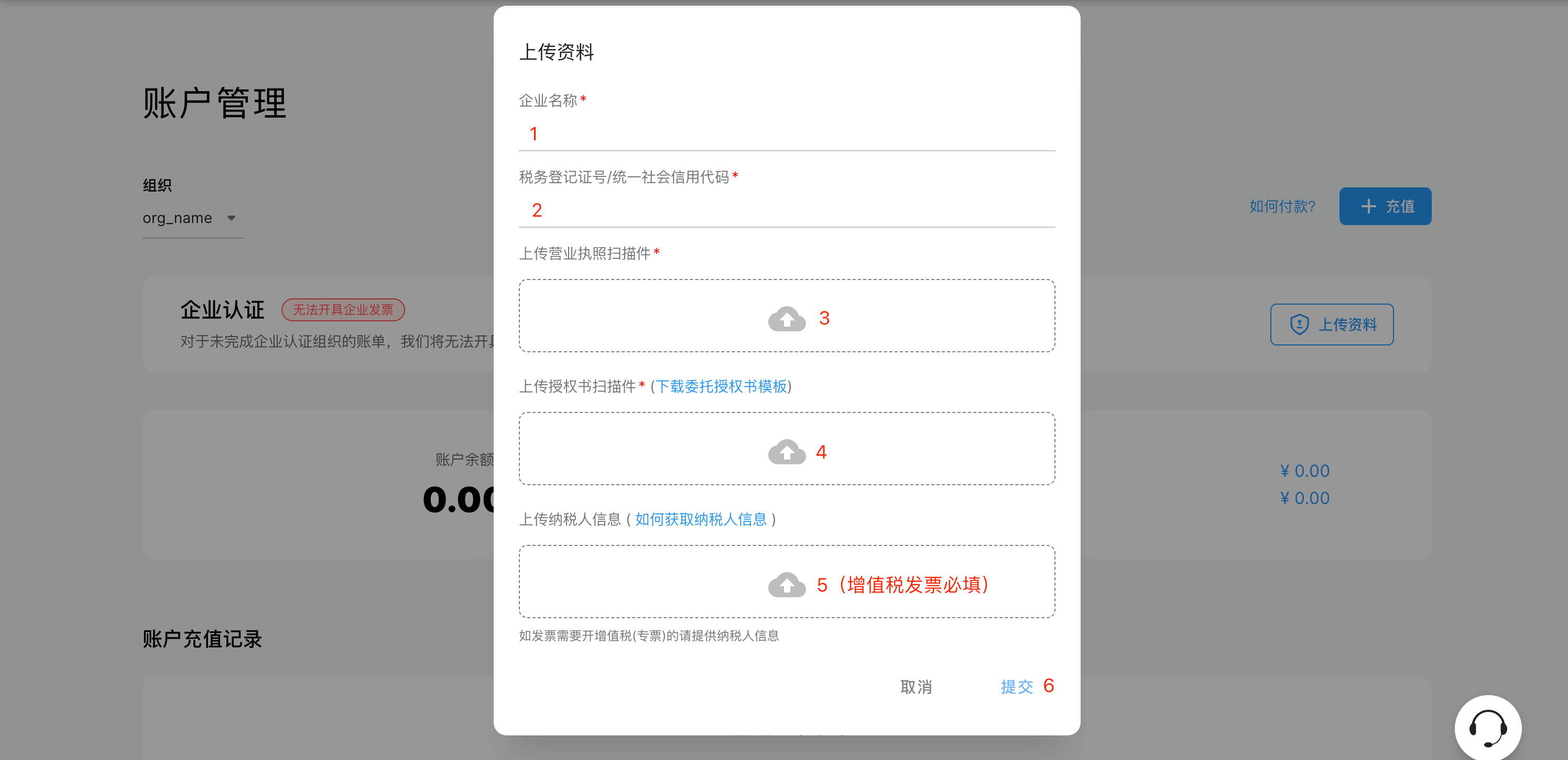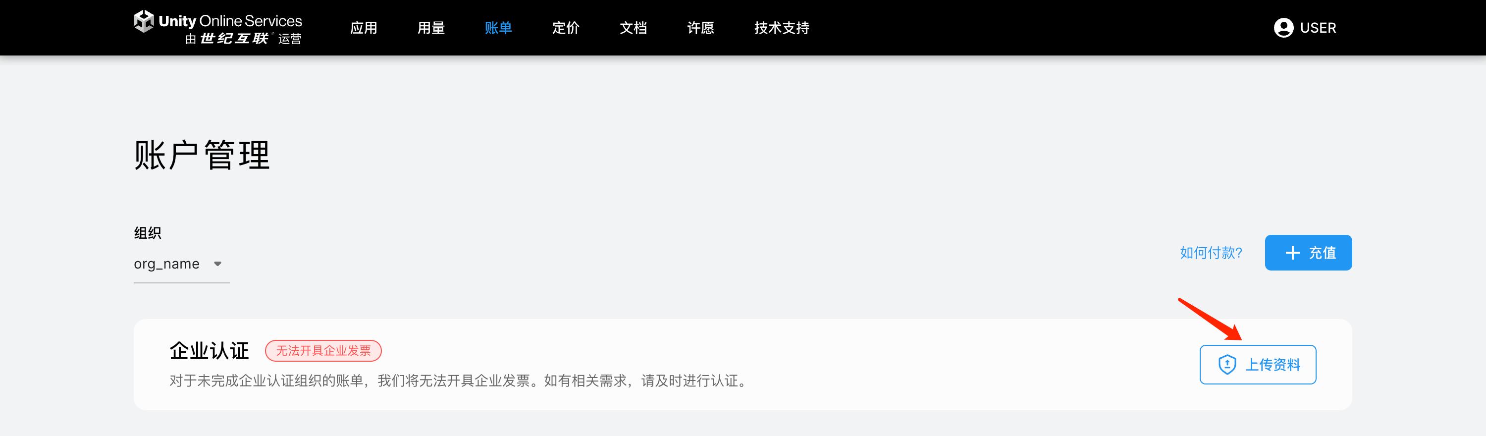 点击顶部菜单栏 「账单」 进入账户管理页面,点击企业认证右侧的 「上传资料」: