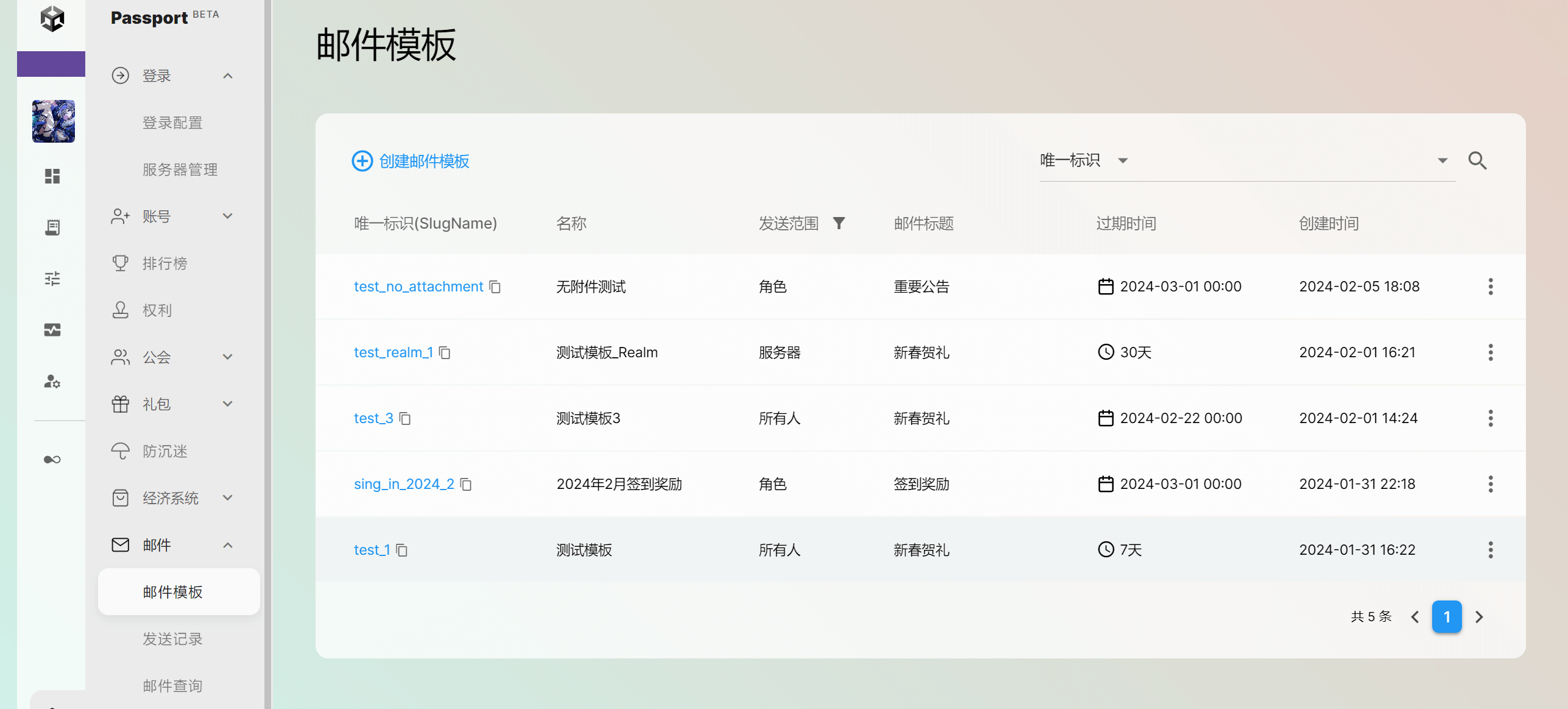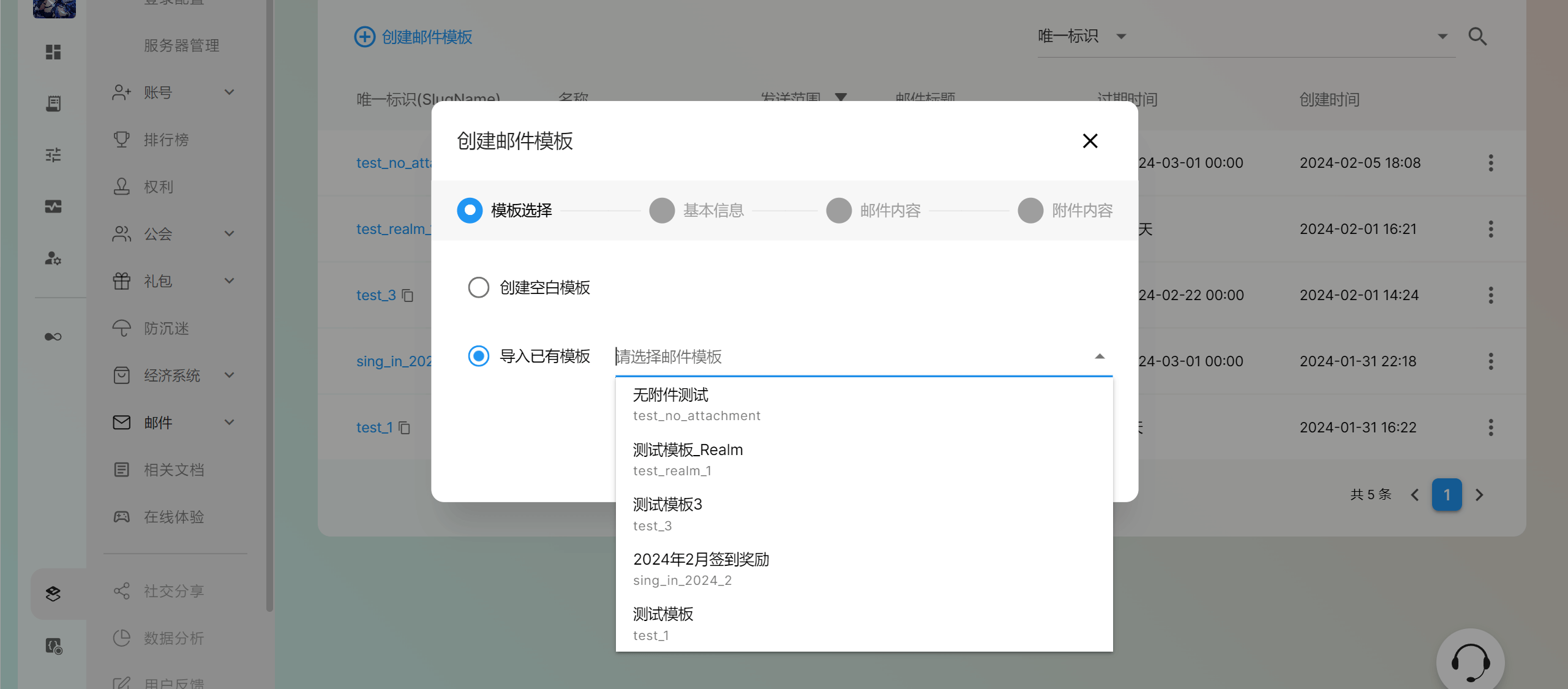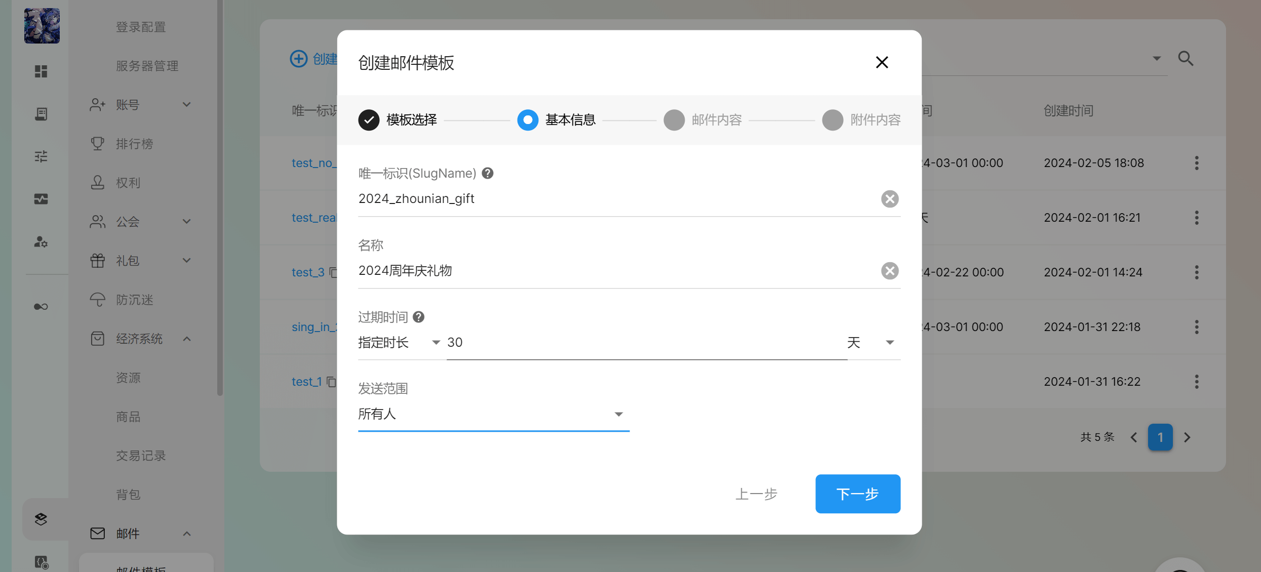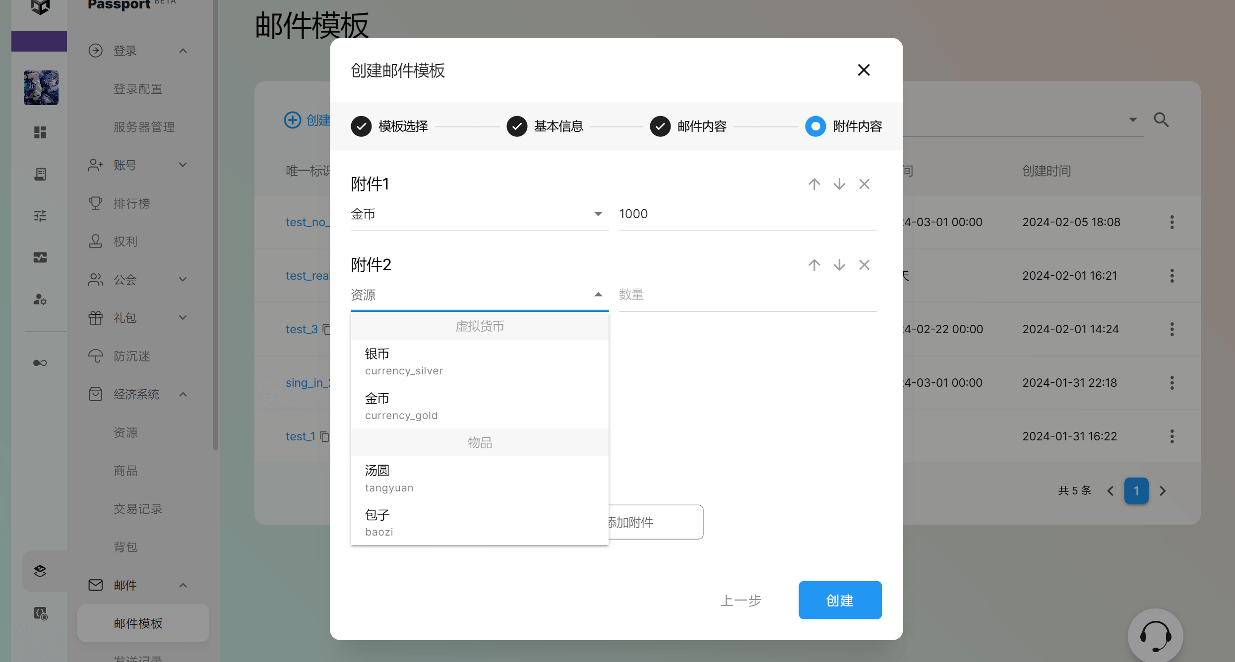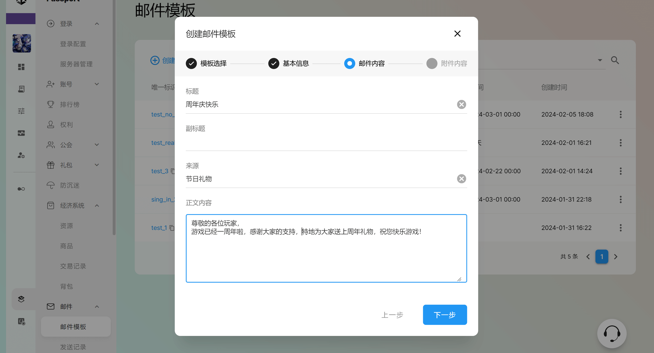 点击左上角 「创建邮件模板」 按钮进行礼包创建。