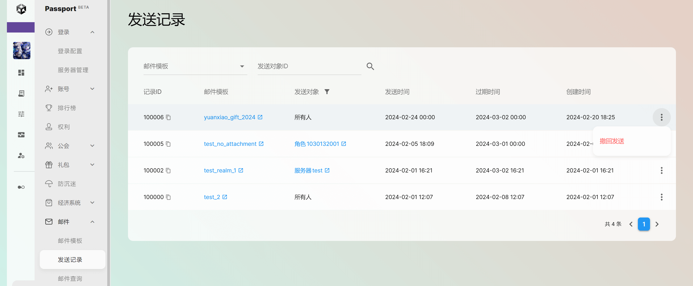用户可以在 「发送记录」 中对某次发送进行撤回操作。如果发送范围是所有人或服务器,撤回会将此次发送的所有邮件都撤回,因此请谨慎使用此功能。