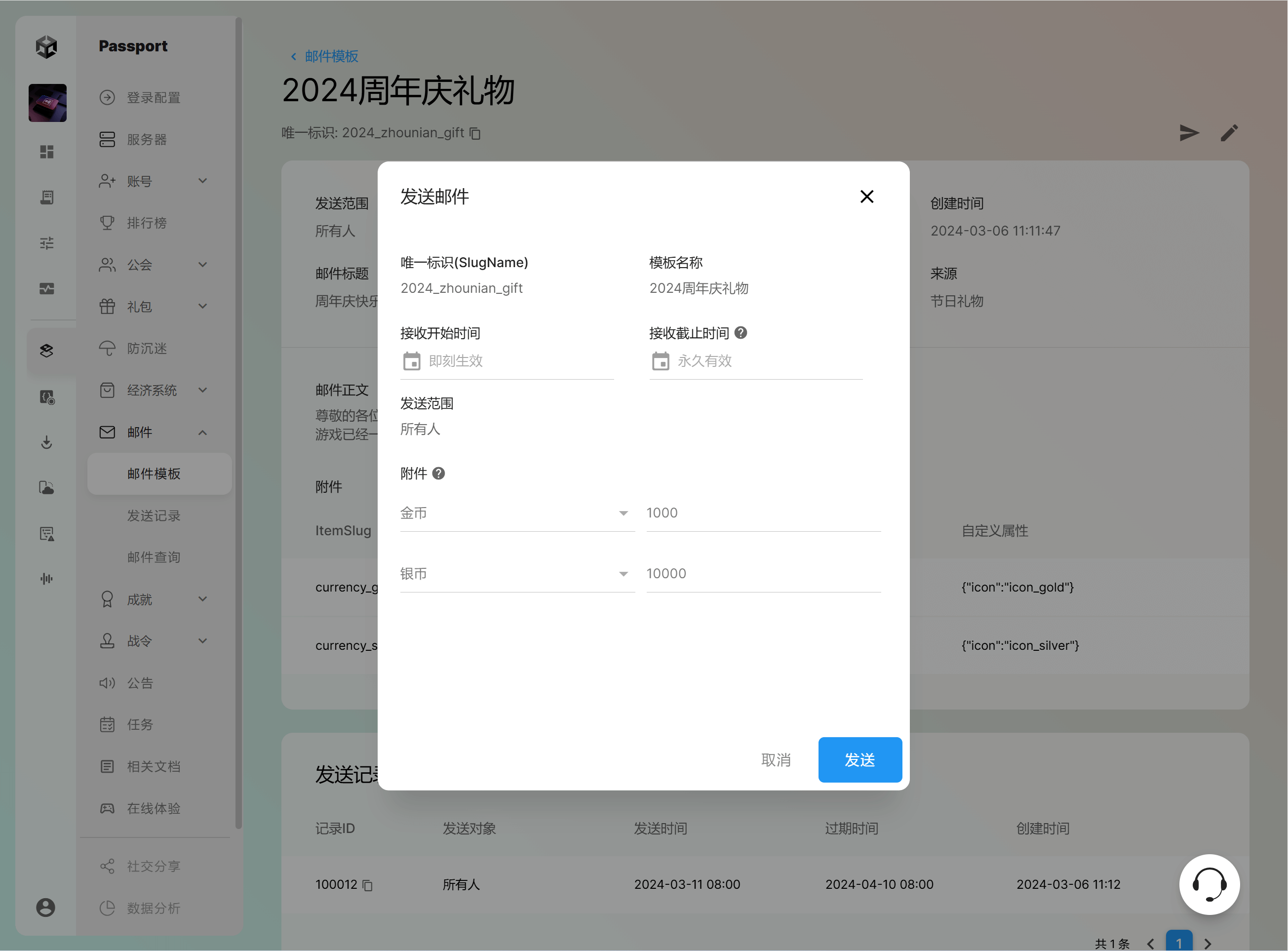 - 例如:发送特定时间段的"节日庆典邮件"(如10月1日0点到10月8日0点),玩家需在这段时间内上线进行邮件的接收。
