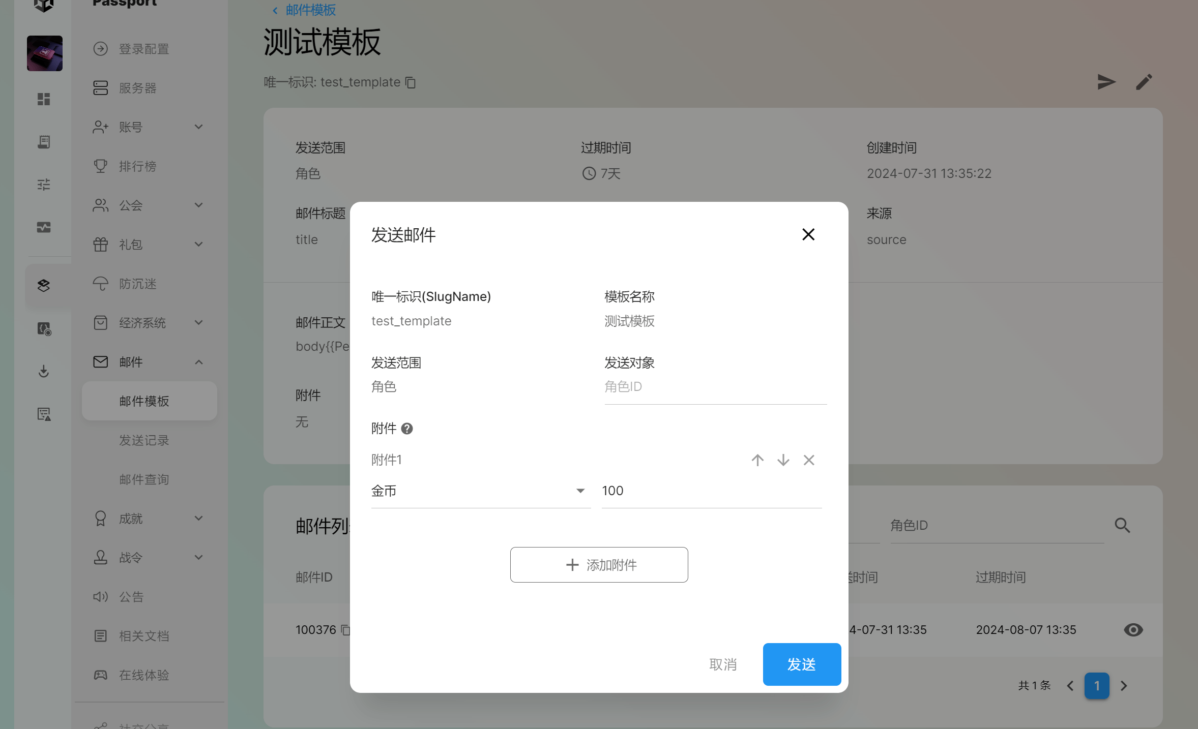 - 附件:默认为发送模板的附件内容,发送范围为角色时可以进行修改覆盖