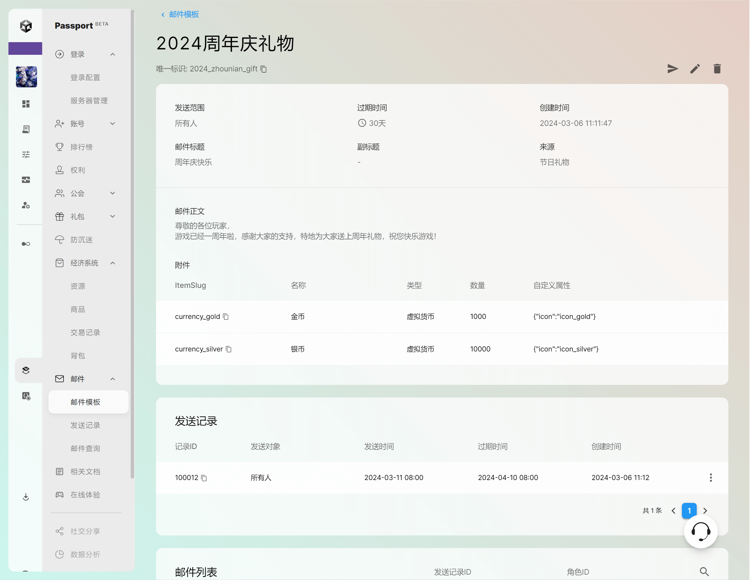 游戏中的邮件系统,可以让玩家阅读、删除邮件,领取邮件附件中的资源。运营人员可以通过后台管理系统群发系统更新、活动通知、奖励或补偿邮件。每个玩家的邮箱容量上限为1000封邮件。邮箱只保留最近12个月的历史数据,超出的将会定期清除。