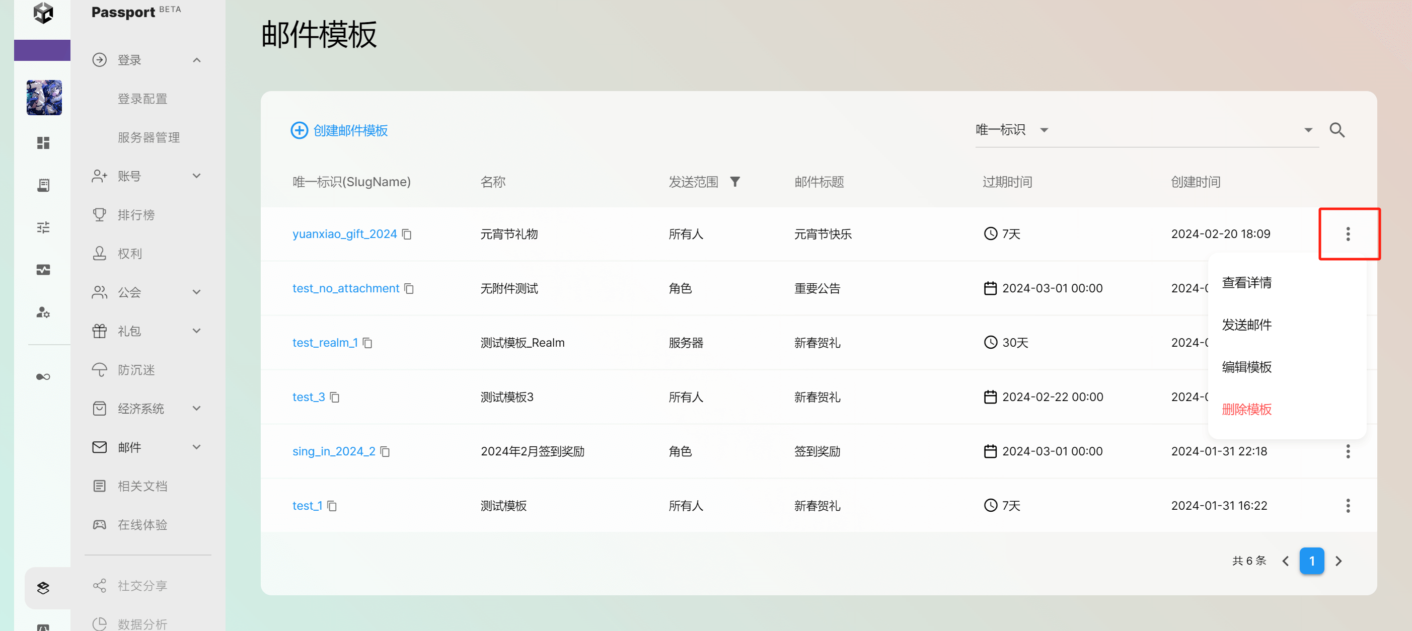 至此,我们创建了一个新的邮件模板,在 「模板管理」 页面中,我们可以对模板进行查看详情、发送邮件、编辑模板的操作。