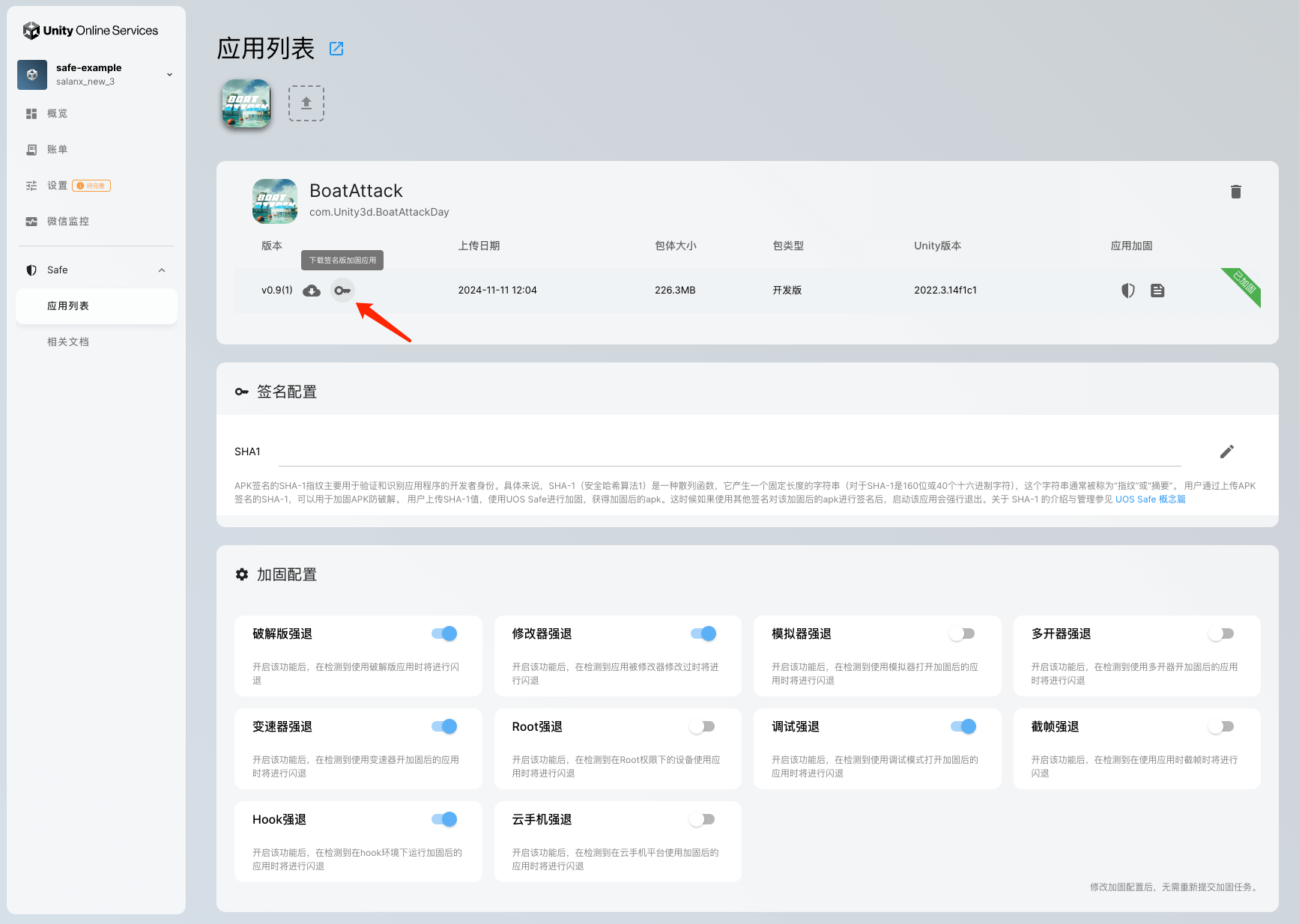 当您采用官方SHA-1进行加固时,您可以在加固任务完成之后下载带签名的包体。